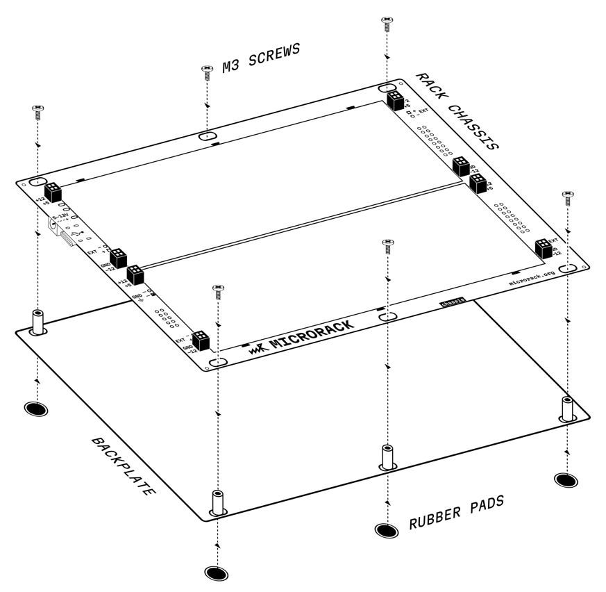 The chassis can be used as a standard Eurorack module or as a standalone portable unit. For standalone use secure the backplate with M3 screws and attach rubber pads (do not overtighten the screws).